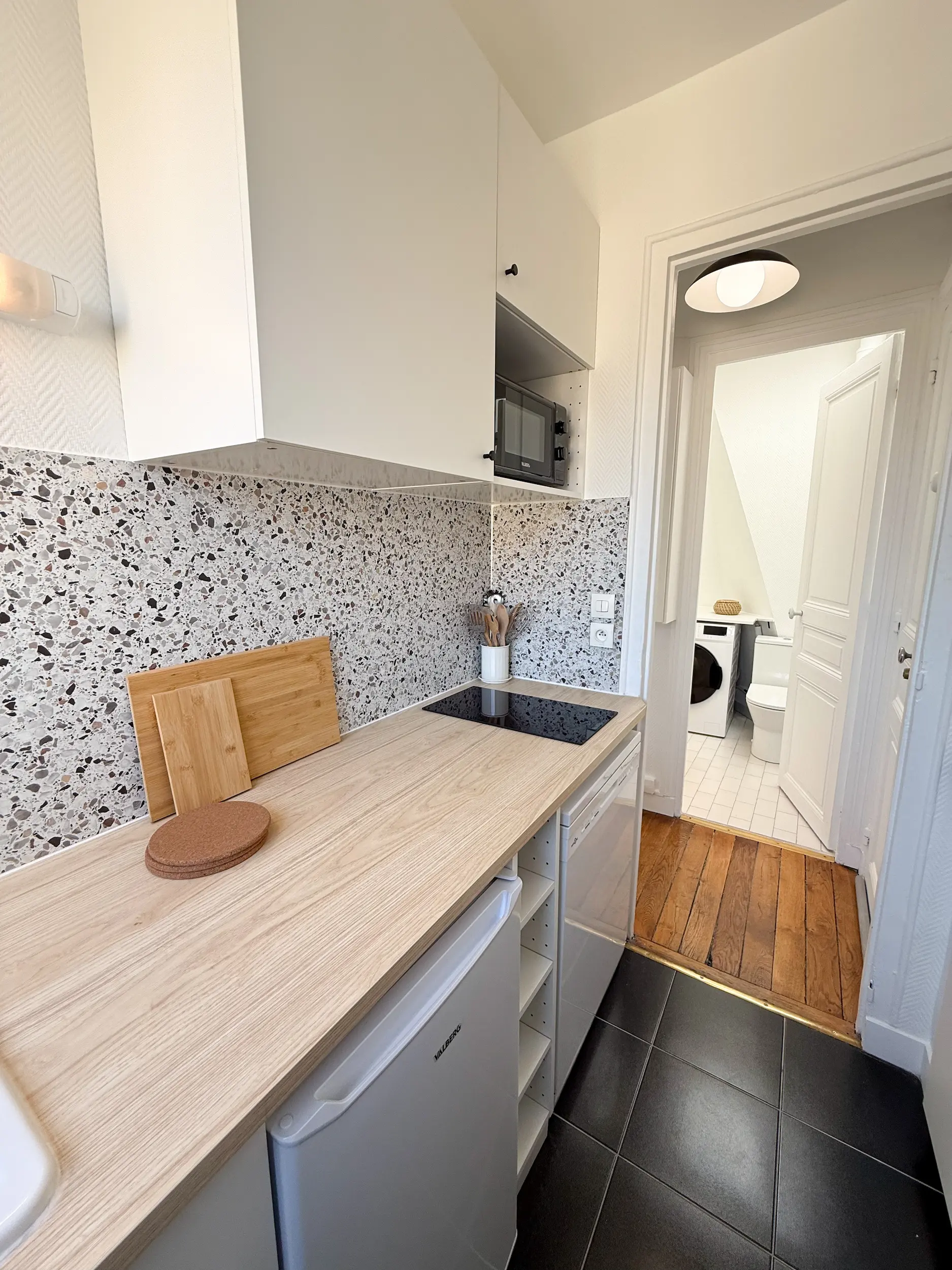 Le logement s’organise désormais autour d’une pièce de vie fluide et ouverte, intégrant cuisine, coin salon et salle à manger, complétée par une chambre avec sa salle de bain.