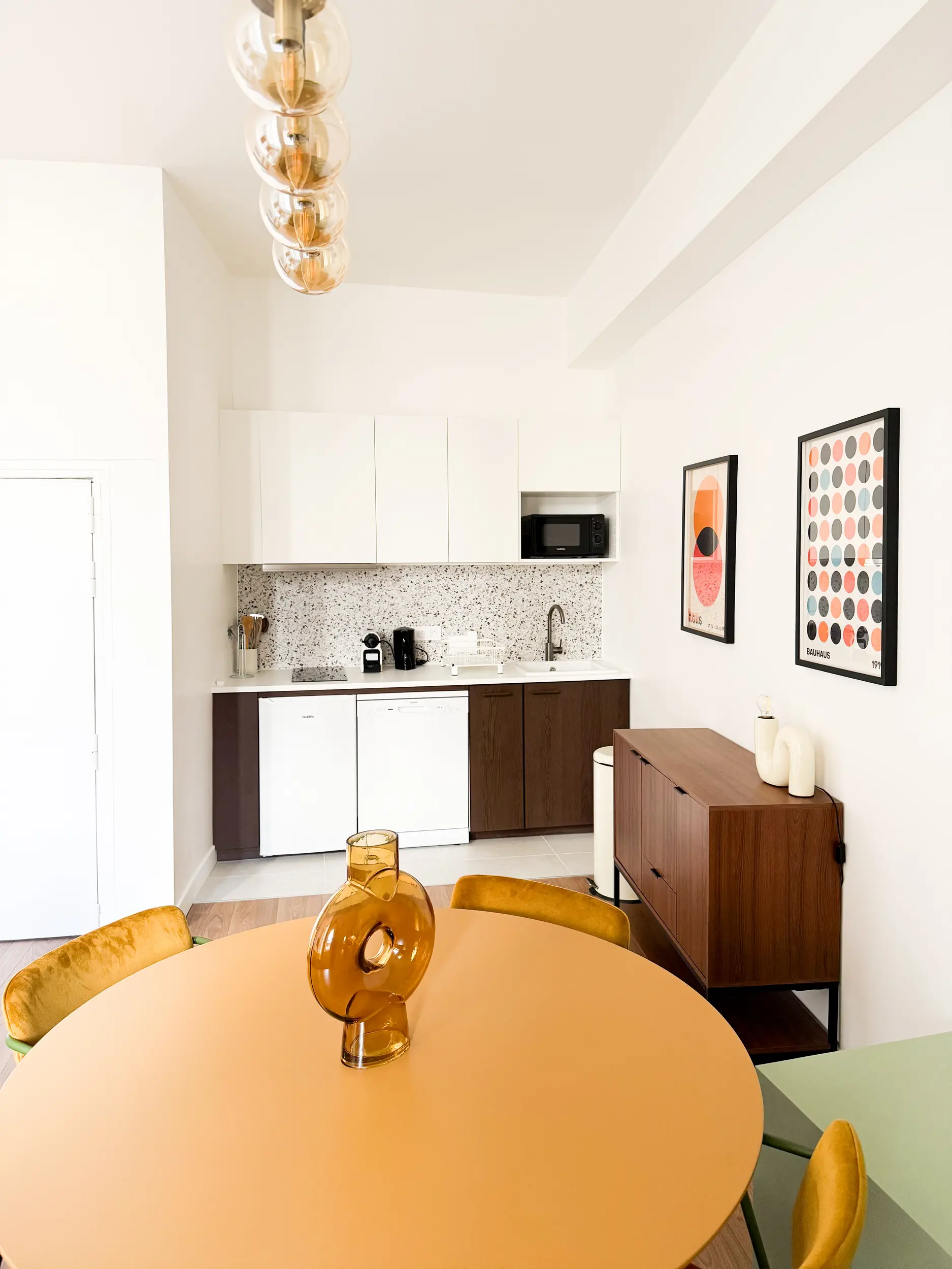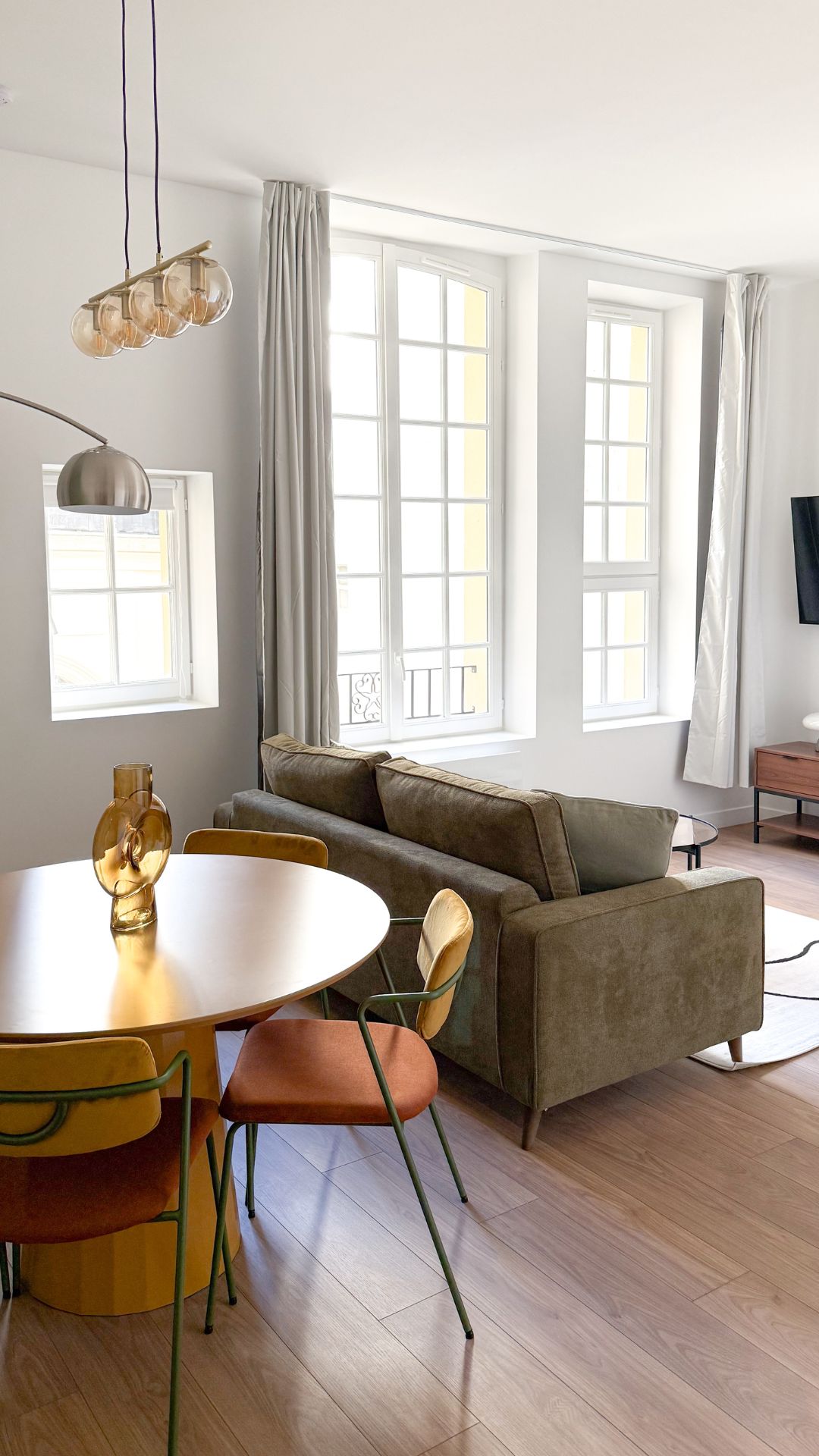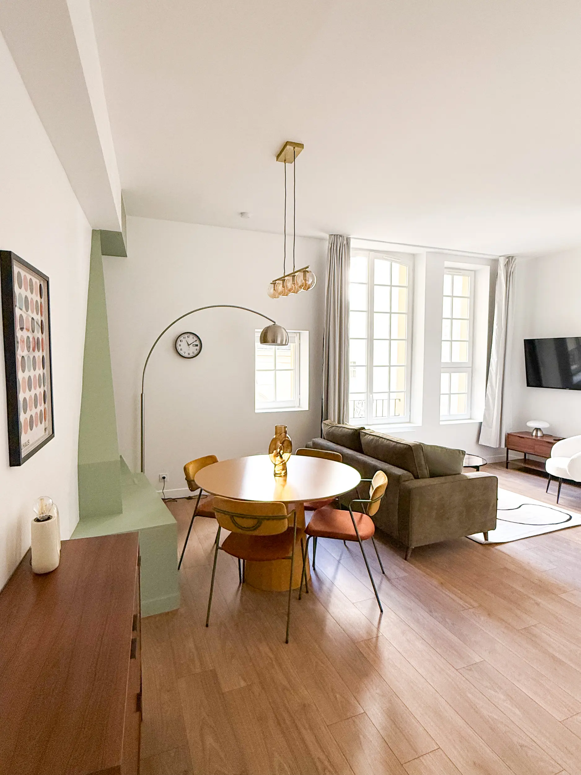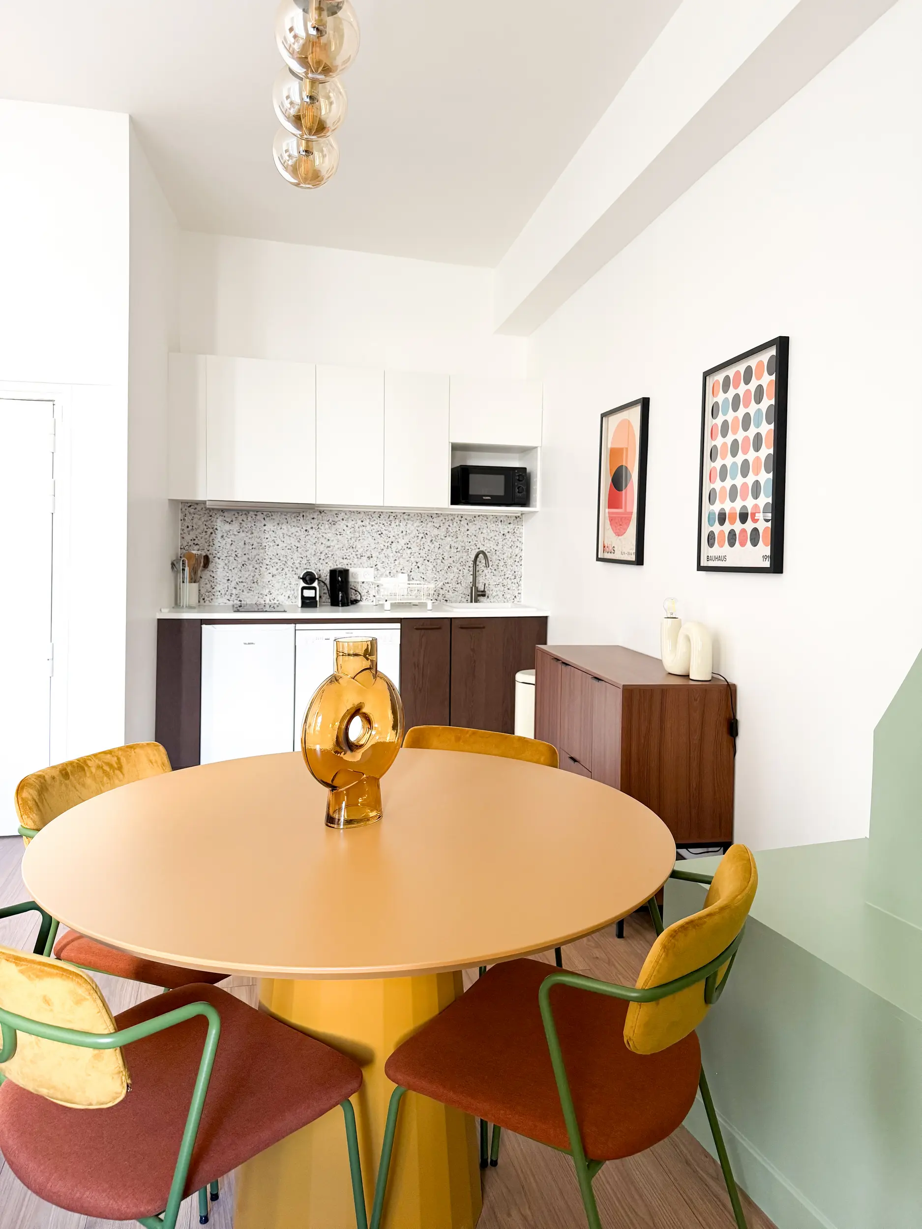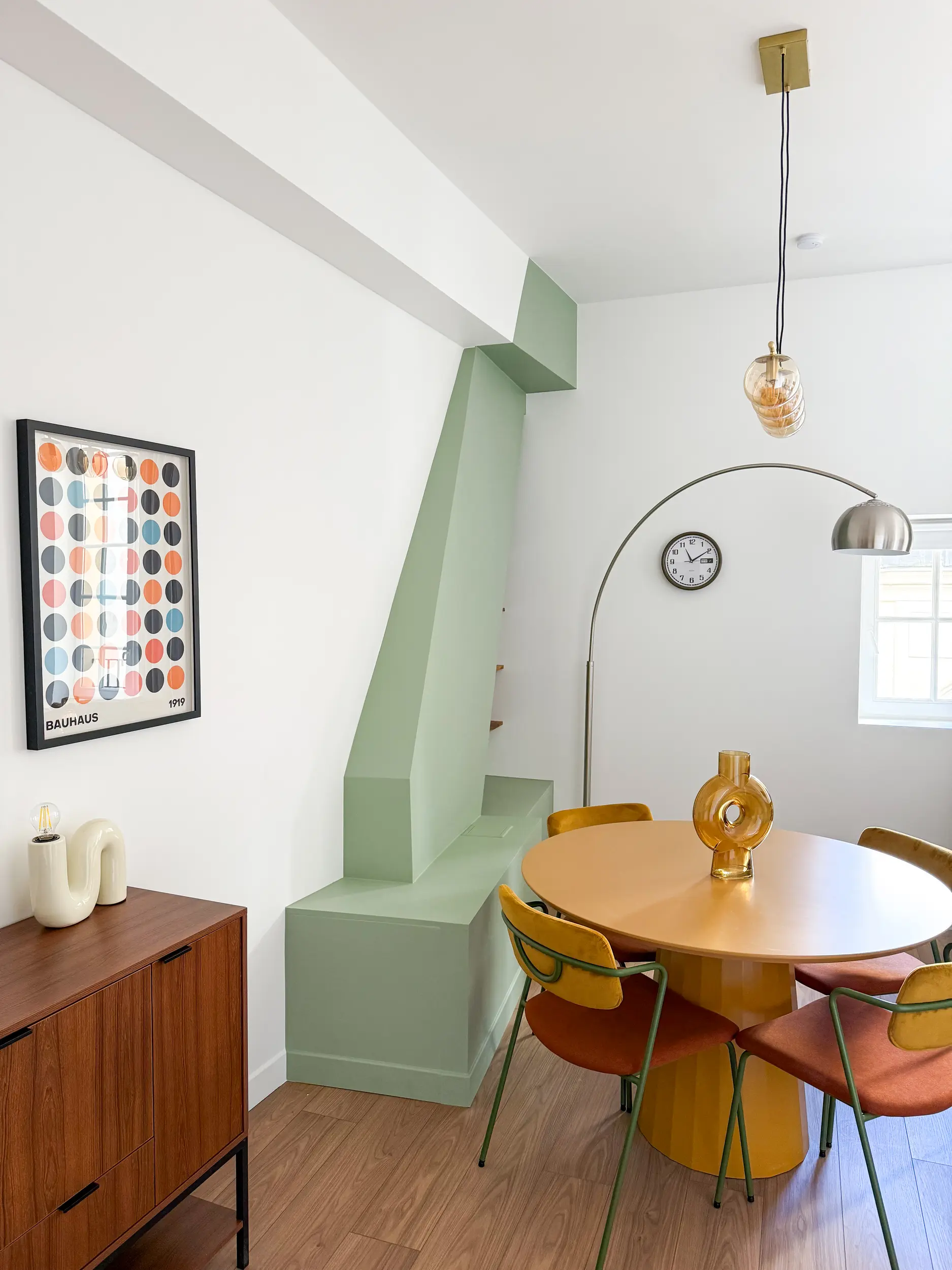 Le projet assume une identité graphique forte, avec une salle à manger pop et colorée — table jaune moutarde, chaises en velours ocre — et un coffrage de cheminée habillé d’un vert doux, devenu un point de focus structurant.