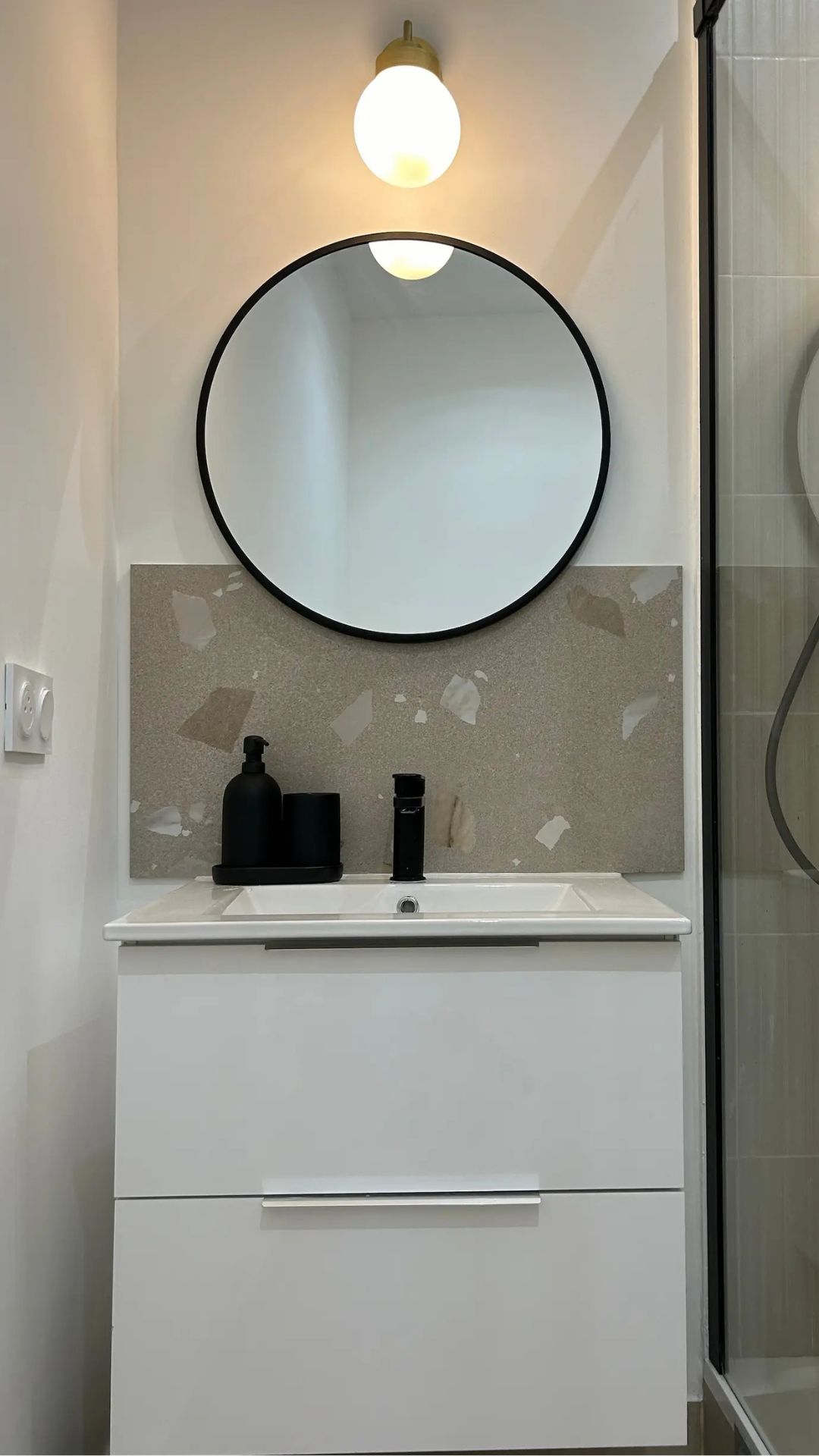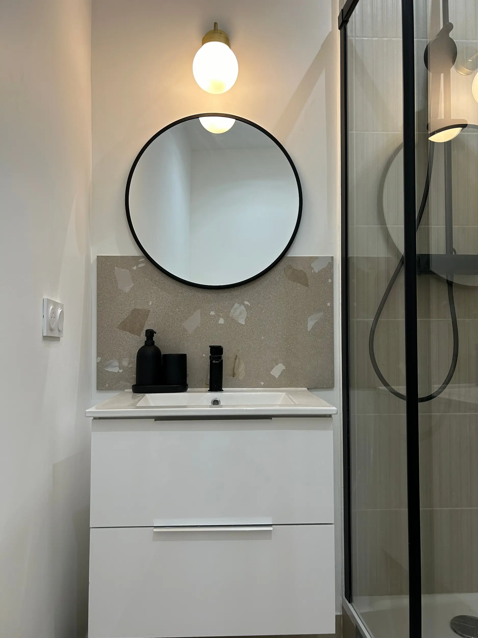 La rénovation a permis la création d’une chambre indépendante, rendue lumineuse grâce à une verrière en partie haute favorisant la circulation de la lumière naturelle, ainsi que l’aménagement d’une salle de bain confortable et de WC séparés. L’entrée est traitée comme un volume à part entière, avec un effet boîte qui structure l’espace sans le fermer.